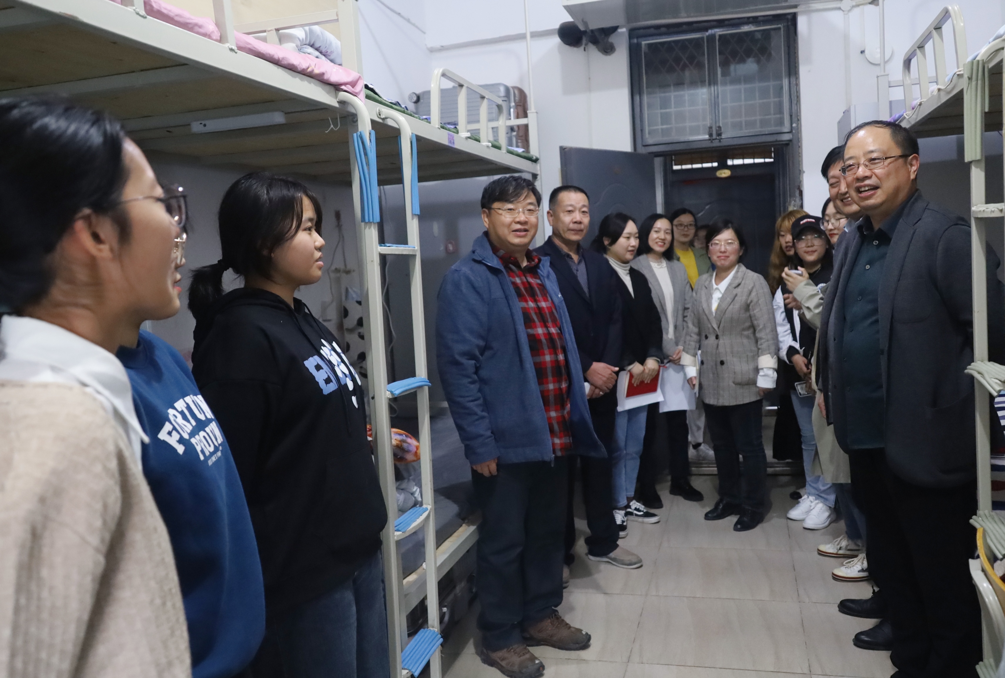 10月12日下午,副校长吕银弟带领基建处、商学院全体中层干部和商学院新生辅导员到宿舍看望2021级新生。